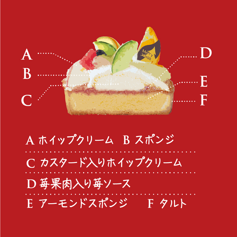 じっくり焼き上げたタルトに、メロン、りんご、オレンジ、グレープフルーツ(ホワイト・ピンク)、キウイフルーツ、ブルーベリーなど、様々なみずみずしいフレッシュフルーツをたっぷりと飾りました。甘めの自家製アーモンドタルトに、甘酸っぱい苺果肉入り苺ソースと優しい味わいのカスタード入りホイップリームを、ふんわり軽やかなスポンジで包み込みました。甘酸っぱいフルーツが絶妙な調和をうみ、口の中に広がります。