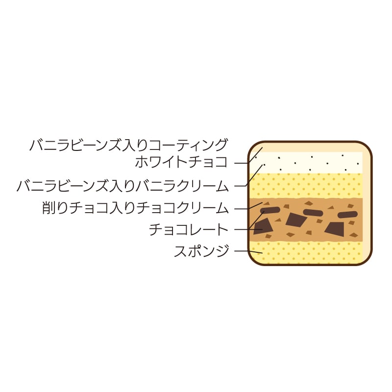 シャトレーゼの人気No.1アイス「チョコバッキー バニラ」をモチーフにしたケーキです。チョコバッキーの特徴である、「パリッと」「ゴリっと」「ゴロっと」と変化のあるチョコ食感と、バニラ味の組み合わせ、まるでアイスの様な見た目に仕上げにしました。アイスでは食べられないスティック(木)部分は、ホロリと口溶けの良い、焼きチョコ菓子をあしらいました。アイスのチョコバッキー同様、ひとつひとつ、表情が違う手作り感。あなたのために作られた「世界にひとつだけ」のケーキです。カカオ分65%のキューブ型のチョコレートとカカオ分54%のフレーク状のチョコレート、2種類のチョコレートで変化のある味わいと様々な食感を演出し、それらを包み込む削りチョコ入りチョコクリームでチョコの満足感をさらにアップさせました。クリームとコーティングチョコに、バニラビーンズをたっぷりと入れているので、チョコに負けない芳醇なバニラ感を楽しめます。