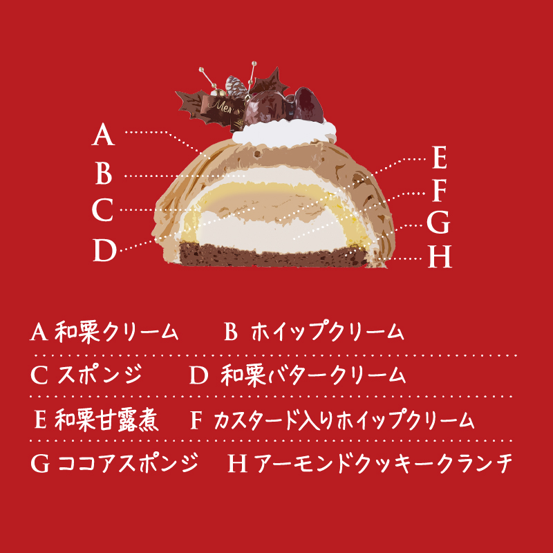 日本人の私たちに慣れ親しんだ、栗本来の味わいをストレートに味わうことができるケーキです。和栗バタークリーム、スポンジ、和栗甘露煮、カスタード入りホイップクリームをサンドし、和栗クリームを絞りました。ホクホクとした食感と、和栗本来の豊かな風味が味わえるようにたっぷりと使用して仕上げました。