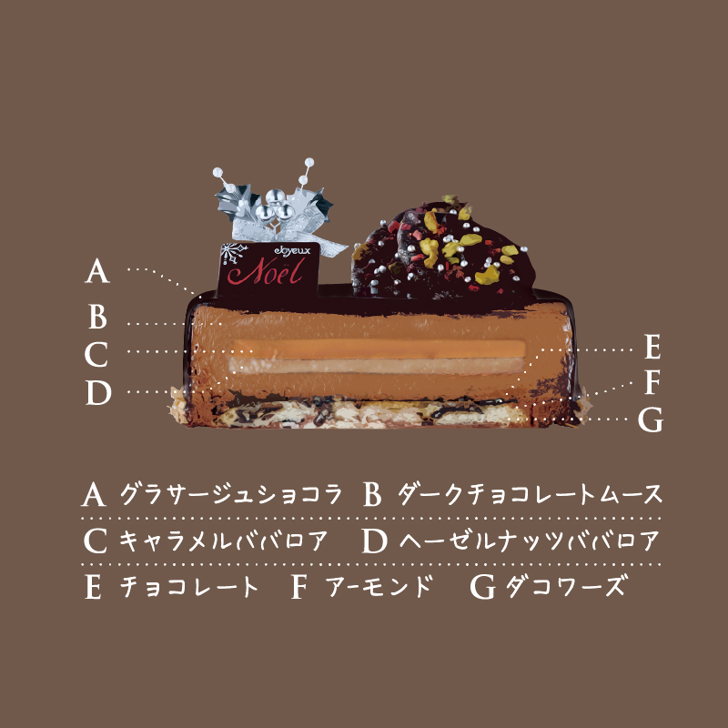 ジャスミンやオレンジを思わせるフローラルな香りのエクアドル産クーベルチュールに苦みのあるキャラメルを合わせたチョコレートムース。中には苦みと香ばしさのあるキャラメルババロアとヘーゼルナッツババロアの2種類を閉じ込めた濃厚な味わいの一品です。