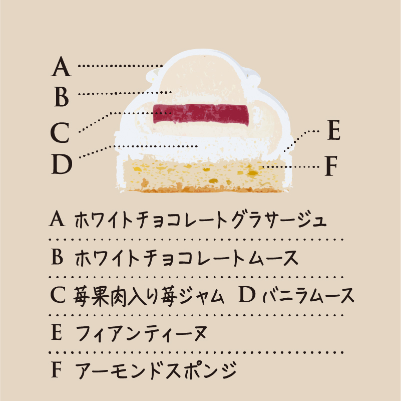 マダガスカル産バニラを使用したムースとミルキーな国産ホワイトクーベルチュールチョコレートを使用したムース2種類を重ね雪だるまに見立てたかわいらしいケーキです。香り豊かなバニラムースと口溶け滑らかでミルキーなホワイトチョコレートムースを組み合わせました。甘酸っぱい苺果肉入り苺ジャムが味のアクセントになっている一品です。