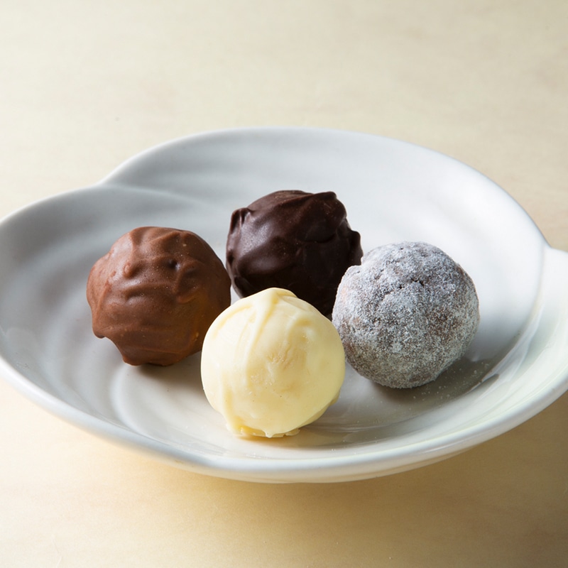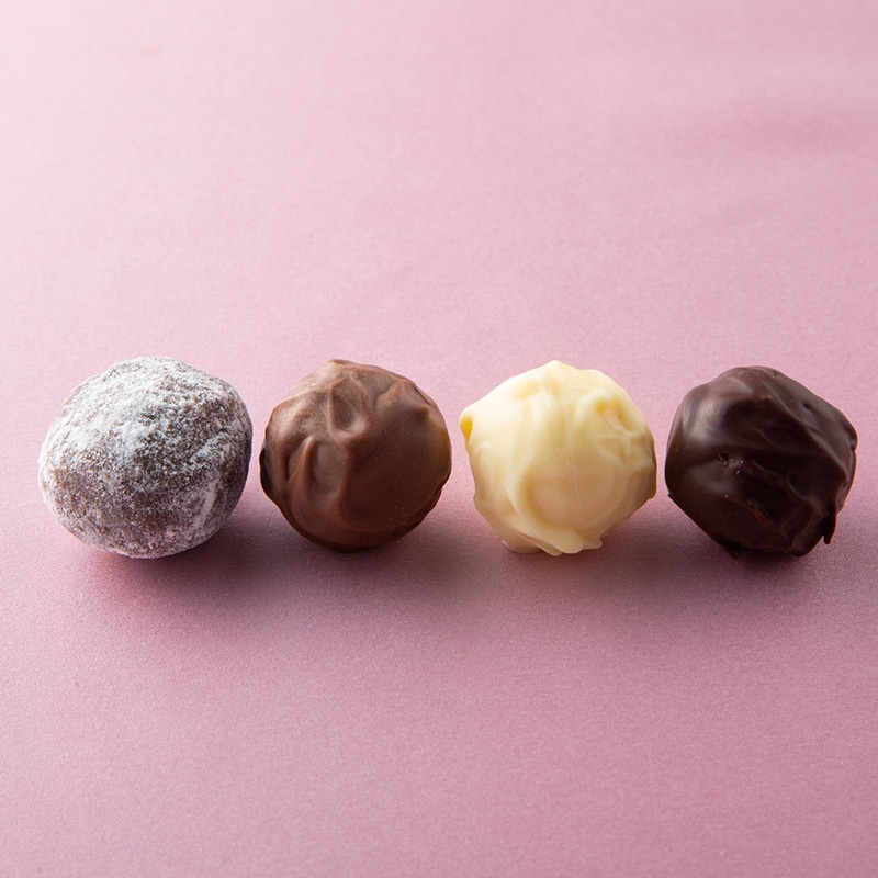 チョコレートに生クリームやバターをたっぷり使用し、さまざまな洋酒で味付けしたあっさりと口溶けの良いトリュフです。