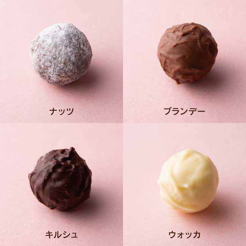 4種類のトリュフ【ブランデー】【キルシュ】【ウォッカ】【ナッツ】を各2個ずつ詰合せました。