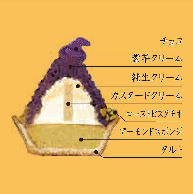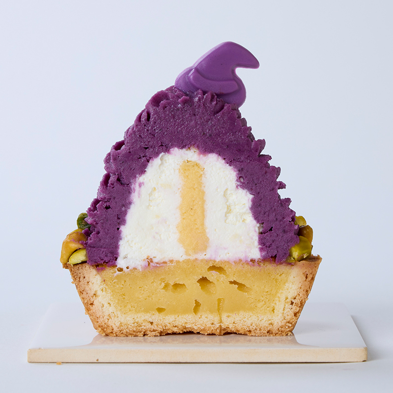 チョコでゴーストの顔を飾り、ハロウィンらしく紫色のゴーストに仕上げた一品です。しっとりした自家製アーモンドタルトの上に、新鮮な卵を使用したカスタードクリームと口溶けが良く後味のすっきりした純生クリーム、優しい甘みのある紫芋クリームを絞りました。周りのピスタチオが食感のアクセントになっています。