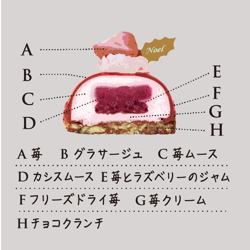 苺ムース、カシスムース、苺とラズベリーのジャムを使用し、トッピングにフレッシュ苺をのせたベリーづくしのぎゅっと甘酸っぱいケーキです。鮮やかな赤色に彩られたケーキが華やかなクリスマスを演出します。香り高く甘い、濃厚な味わいの苺のムースになめらかで甘酸っぱいカシスムース、果肉感の感じられる苺とラズベリーのジャムを合わせました。土台のチョコクランチがザクザクしており食感も楽しい一品です。