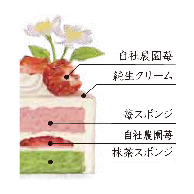 ひなまつりに欠かせない伝統的なお菓子・ひし餅に見立たて、苺スポンジ、純生クリーム、抹茶スポンジをサンドしました。飾り切りの自社農園苺を華やかに飾った、ひなまつりのお祝いにぴったりなケーキです。しっとりとした苺スポンジと抹茶スポンジで、新鮮で糖度が高く甘い自社農園苺とキレがあり、口溶けの良い北海道純生クリームをサンドしフレッシュな自社農園苺を飾りました。