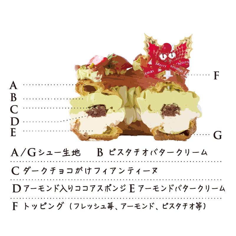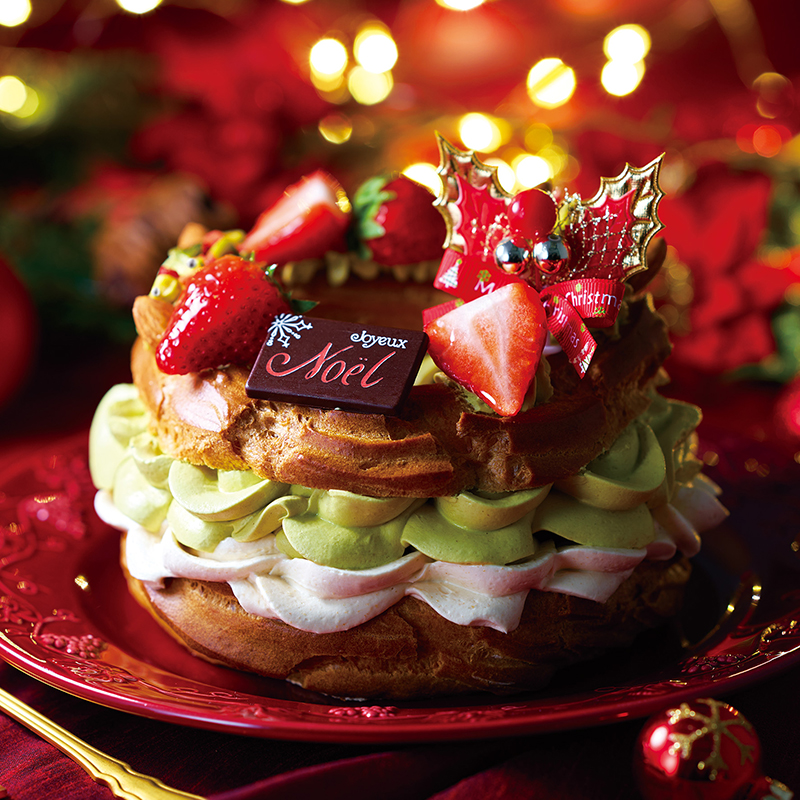 口溶け滑らかな2種類のバタークリームをうみたて卵を使用したシュー生地と合わせました。フレッシュ苺を飾りローストしたアーモンド、ピスタチオ、フリーズドライ苺、アラザンを散りばめた色鮮やかなクリスマスリース型の見た目にも心踊る一品です。濃厚でありながら、ふわっと口溶けの良い滑らかな2種類のバタークリームに味と食感のアクセントにダークチョコがけフィアンティーヌ、アーモンド入りココアスポンジを香ばしく焼き上げたシュー生地と合わせました。甘味と酸味のバランスの良いフレッシュ苺がケーキをより引き立てます。