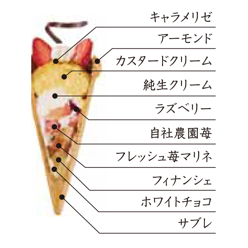 コーン型のサブレに自社農園苺や純生クリーム、天面をキャラメリゼした自社農場放牧平飼いたまご使用したカスタードクリームをのせた、ソフトクリームのような食べ歩き専用のワンハンドスイーツ。コーン型の香ばしいサブレに乳の風味が強い純生クリーム、濃厚なカスタードクリーム、甘酸っぱいフレッシュ苺マリネ、ラズベリー、バターとアーモンドとヘーゼルナッツの程よい香りが絶妙なフィナンシェを詰込みまるでケーキをワンハンドで食べているかのような新感覚な一品です。
