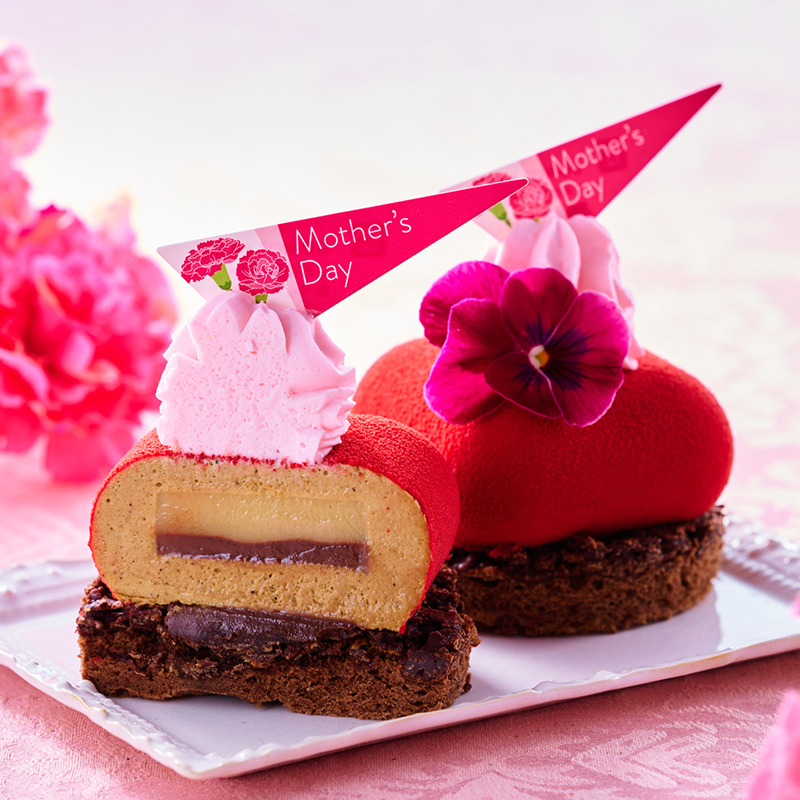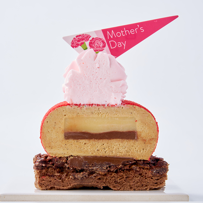 女性に人気のフレーバー「紅茶」を使い、真っ赤なピストレがけチョコで仕上げた、母の日限定のケーキです。芳醇なアールグレイの香りが広がり、甘さ控えめなチョコと組み合わせました。ベルガモットと白ワインのカードが爽やかにさっぱりと食べれる仕立てです。チョコクランチがサクサクと食感のアクセントになっています。
